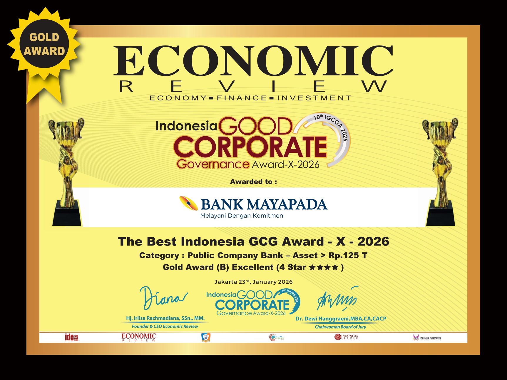 23-Jan-2026 | The Best Indonesia GCG Award-X-2026 Gold Award (B) Excellent (4 Star ****) Category: Public Company Bank - Asset > Rp 125 T | ECONOMIC REVIEW |
